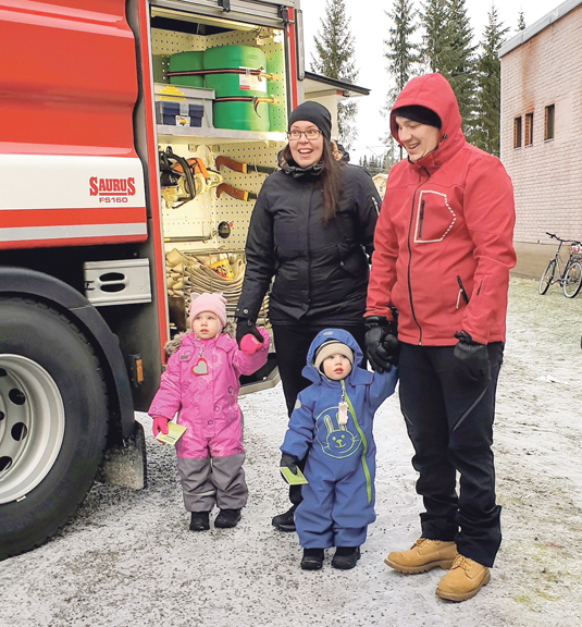 Paloautoon tutustumassa Emilia Lehtola, Katja Karjalainen ja Leo Mehtälä.