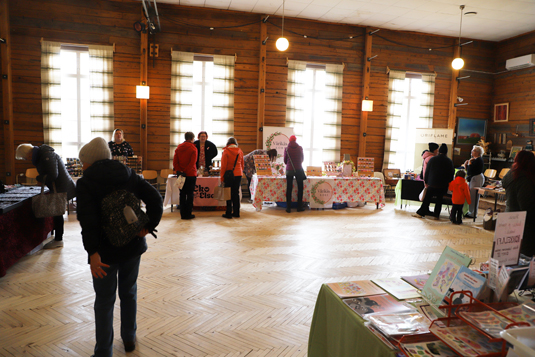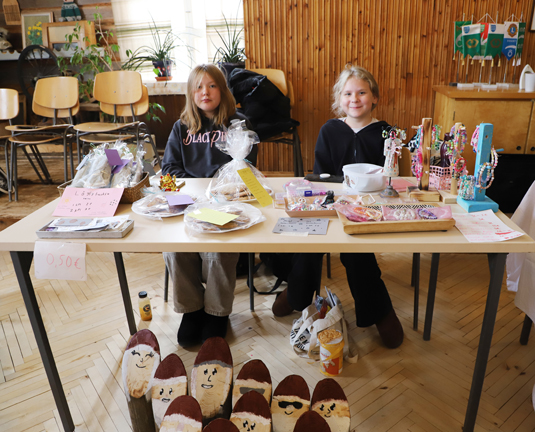 Neljättä luokkaa käyvät Jutta Keränen ja Isla Leino istuvat pöydän takana, joka on tulvillaan erilaisia käsitöitä: helmikoruja, -rasioita, ja -pusseja, kirjanmerkkejä ja saunatuoksuja. Onpa siinä tarjolla myös maukkaan näköisiä suklaahippukeksejä. Kun katseen suuntaa pöydän alle, pilkottaa sieltä muutaman puusta tehdyn tontun päät. Tuotteitaan kaverukset myyvät naistenmessuilla, jotka pidetään Vihannin nuorisoseurantalolla. Tyttöjen lisäksi salissa omia luomuksiaan myy kymmenkunta muuta myyjää.