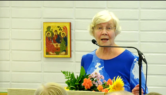 Kuva1: Vuoden vanhuksena palkittu Liisa Poikkimäki tunnetaan Oulaisten kirjaston satutätinä. Kuvakaappaus: Livekuvaukset.fi